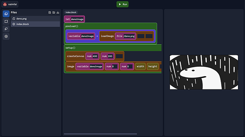 ... and the activity bar of (2022) Replitlet denoImage function preload() {denoImage=loadImage(_findFile("/deno.png") ) } function setup() {createCanvas(Number("400") , Number("200") ) image(denoImage , Number("0") , Number("0") , width , height ) }