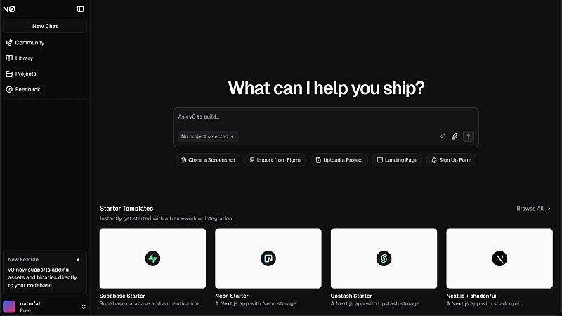 The real v0 has a lot. A bunch of random tabs (community, projects, feedback), ways to manage your account, templates, the actual chat and editor interface, and more. However, my project is merely a clone that's designed for local use. I don't need to implement a community tab or accounts when everything should be offline. Above all, the most important feature is generating a user interface with an LLM, and providing some mechanism to iterate over and copy the resulting code.