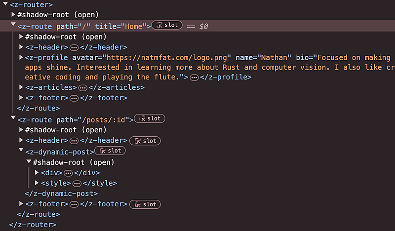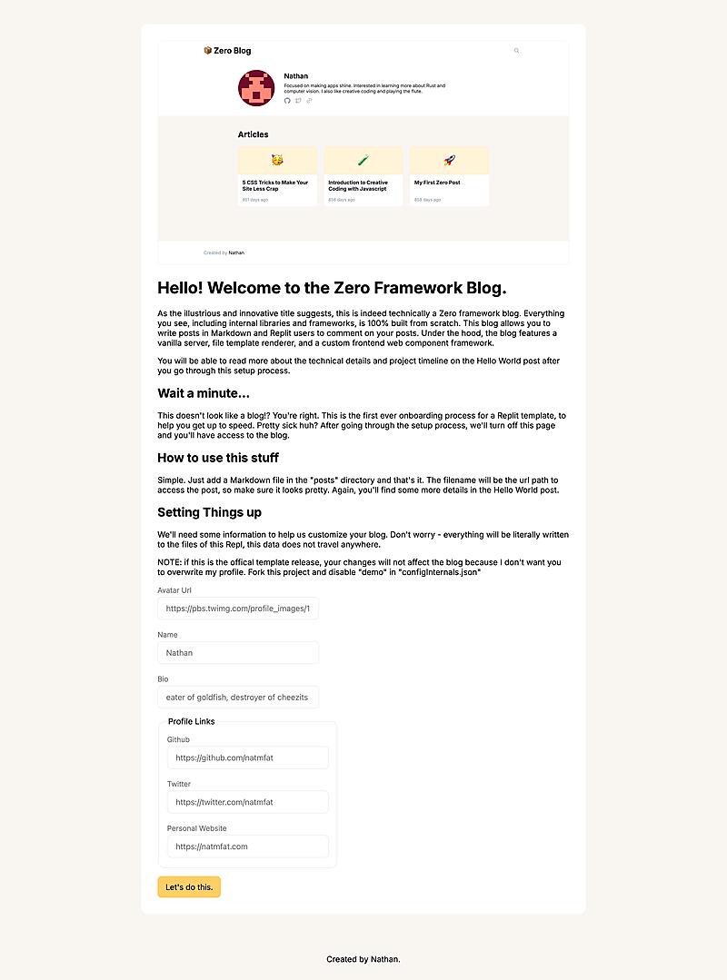 Zero Router containing two routes: the "Home" route and dynamic "Posts" routeTechnically, Zero Blog is NOT a "zero dependency" blog completely because I use Replit Auth and their KV Database to authenticate and store comments. I could have interfaced with the API directly, but I figured using some Replit products and packages was a necessity to create a Replit-themed template. Interestingly, Replit Auth is "technically" not a dependency because Replit automaticallys adds unique headers for logged-in users, so it is not necessarily an installed package. In any case, Zero Blog's implementation necessitates deploying on Replit because of its tight integation with Replit products. I will admit that not everything should be built from scratch - public libraries are often far better maintained, more feature complete, and battle-tested compared to what a single developer could make in a week - but building Zero Blog was certainly a fun experience. Furthermore, I realize that lightweight Vanilla Javascript libraries does not really benefit the server-end (unless the concern is having more features may impact performance or that rare case were storage actually matters), because the client is not consuming that complexity anyways.import Zero, { ZeroUtils } from "/lib/Zero"; Zero.define( "z-header", class ZHeader extends Zero { render() { return h.header( // yup, styles are inlined (or added as a style tag in the shadow DOM) { style: globalStyles.bgWrapper }, h.div( { style: styles.headerDiv }, h.a( {}, h.zLink( { href: "/" }, h.h1({ style: styles.headerLink }, "📦 Zero Blog"), ), ), h.zSearch(), ), ); } }, );