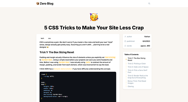 Zero Blog post, zoomed-out to show the table of contents